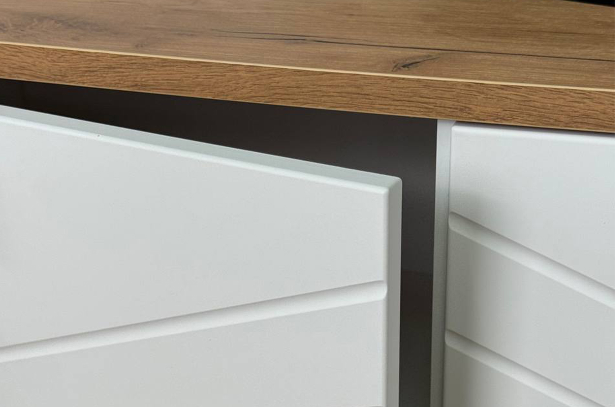 · Качественные материалы: Прочная столешница 22 мм, фасады из МДФ с фрезеровкой, массив дерева в опорах и ручках.