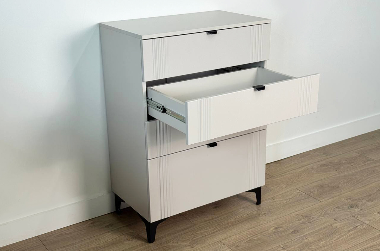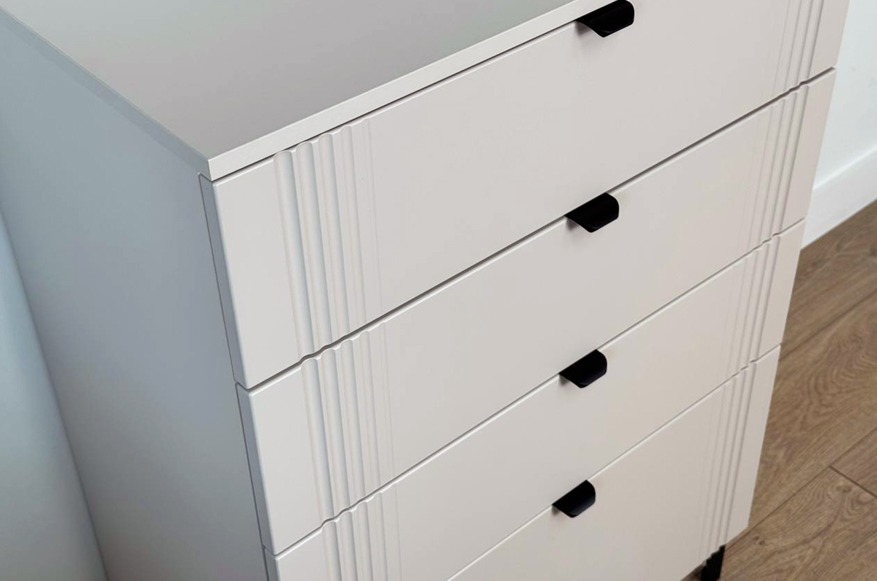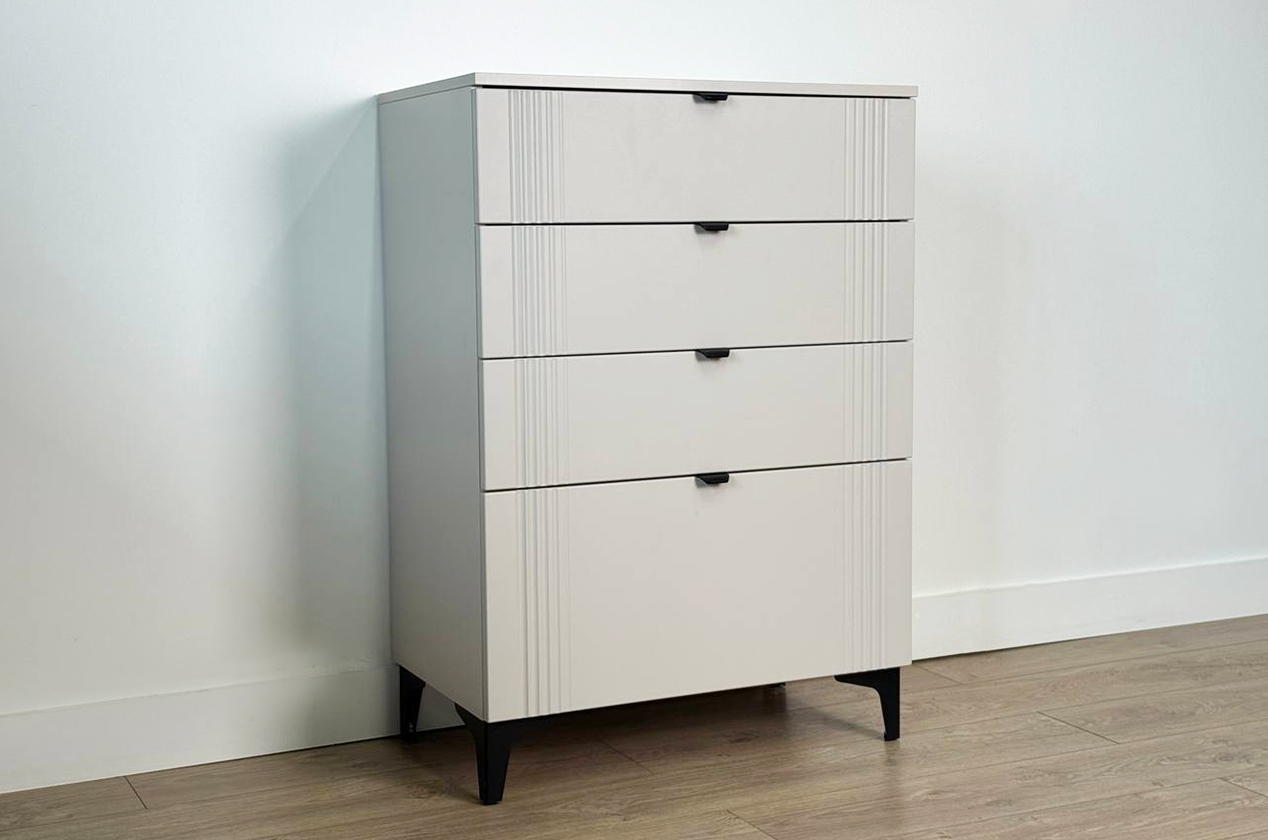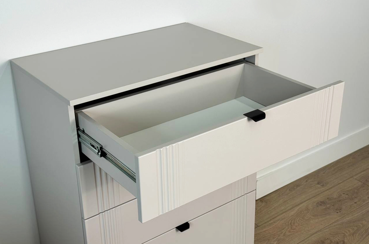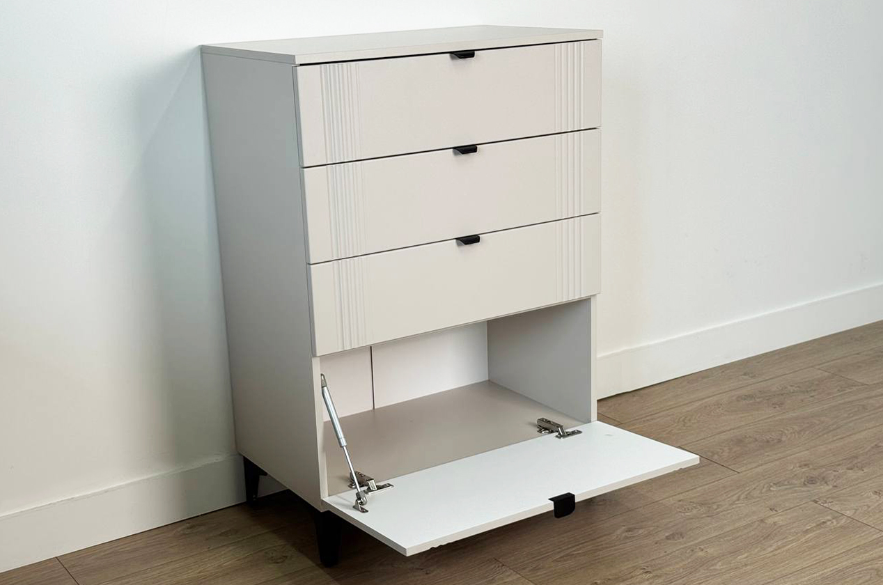 • • Стиль и долговечность: Корпус из прочного ЛДСП и элегантный фасад из МДФ с декоративной фрезеровкой и защитной пленкой ПВХ.