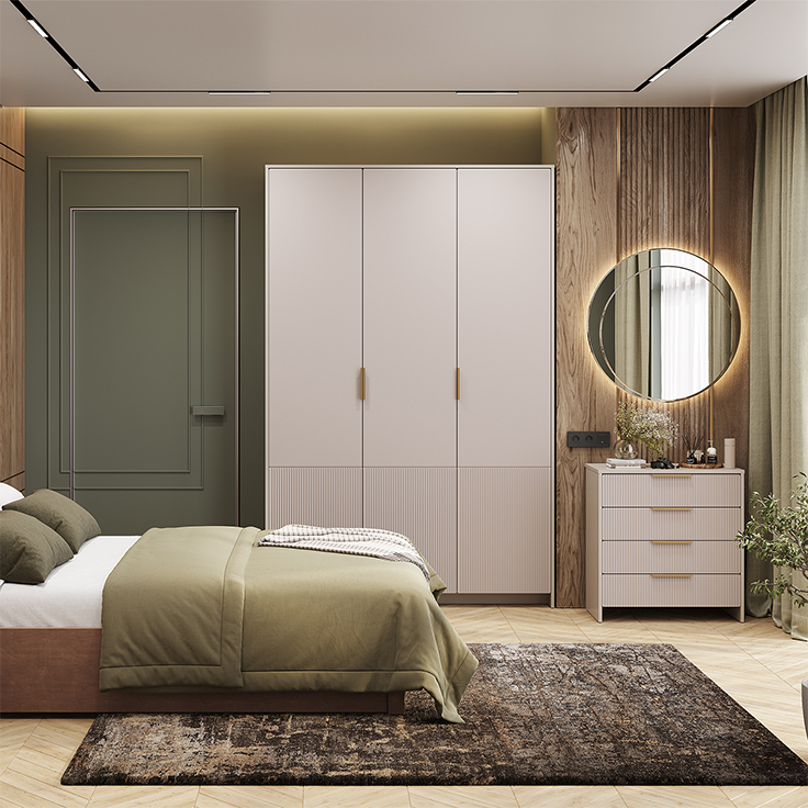 Нежные оттенки фасада «айриш» и корпуса «кашемир» создают атмосферу уюта, а элегантная фрезеровка на фасаде добавляет модели изысканности и подчеркивает текстуру МДФ. Стильные ручки из АБС-пластика (128 мм) в цвете «пыльно-матовое золото» завершают эстетичный образ тумбы.