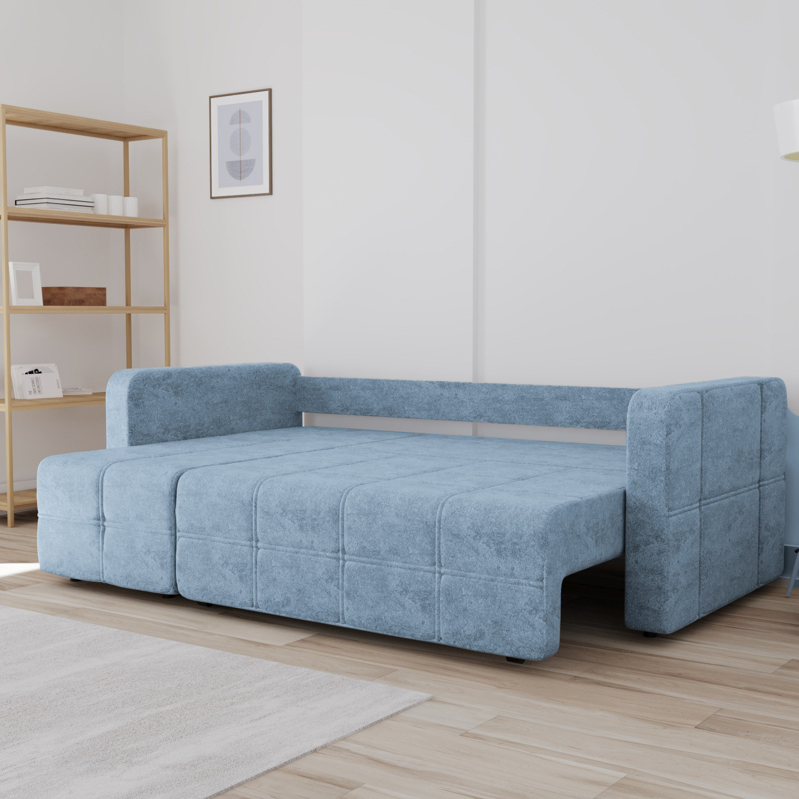 Диван обладает средней жесткостью, что оптимально для комфортного и здорового сна, поддерживая позвоночник. Обивка выполнена из износостойкой ткани, устойчивой к повседневным нагрузкам, что гарантирует дивану опрятный вид на годы.