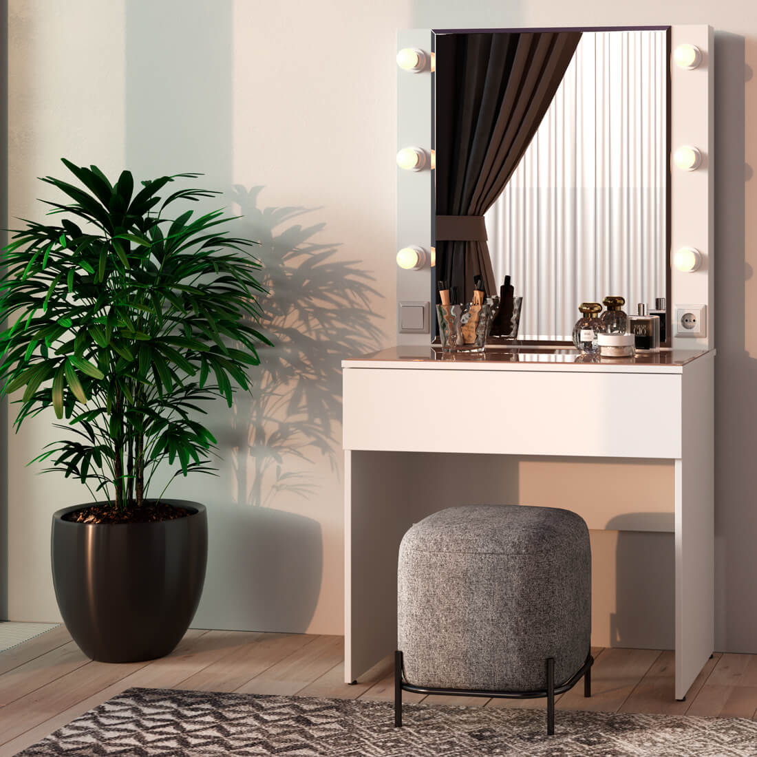 Косметический стол «Мемори» СТ-03 — это идеальное решение для создания уютного и стильного уголка в вашей спальне или гардеробной. Модель выполнена в белом цвете, который станет украшением любого светлого интерьера. Главная особенность стола — подсветка по периметру зеркала, которая создает идеальные условия для макияжа и ухода за собой. Стол оснащен съемной стеклянной столешницей, удобным выдвижным ящиком для косметики и встроенной розеткой для подключения электроприборов. Правильный выбор по лучшей цене — стол «Мемори» СТ-03.