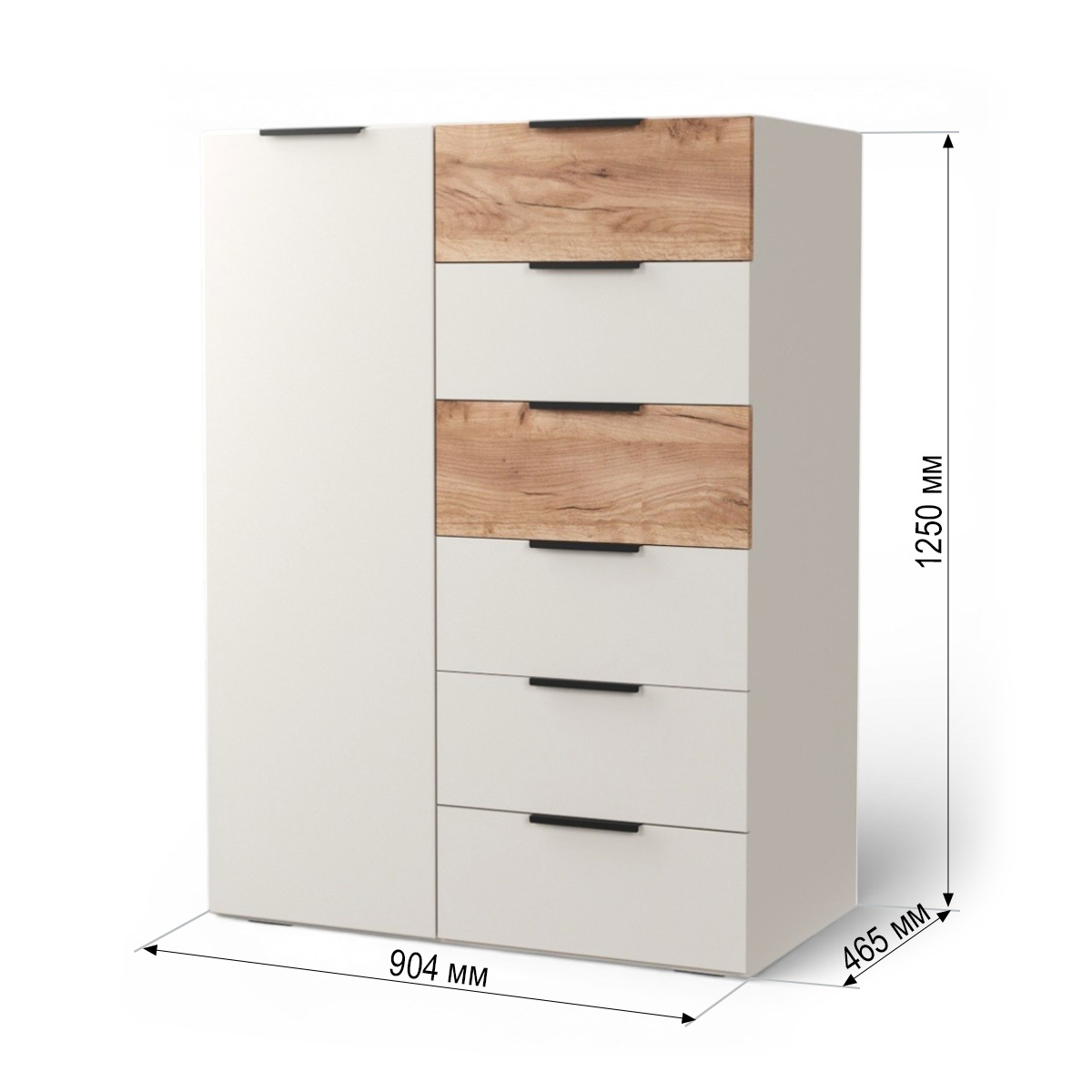 Элегантный комод Севиль с комбинированной отделкой: корпус в цвете Кашемир и фасады под натуральное дерево Дуб Крафт. Модель оснащена шестью просторными выдвижными ящиками на надежных роликовых направляющих и функциональным отсеком с дверцей и внутренними полками. Идеальное решение для хранения вещей в спальне, гостиной или прихожей. Сочетает в себе лаконичный дизайн и высокую вместительность.